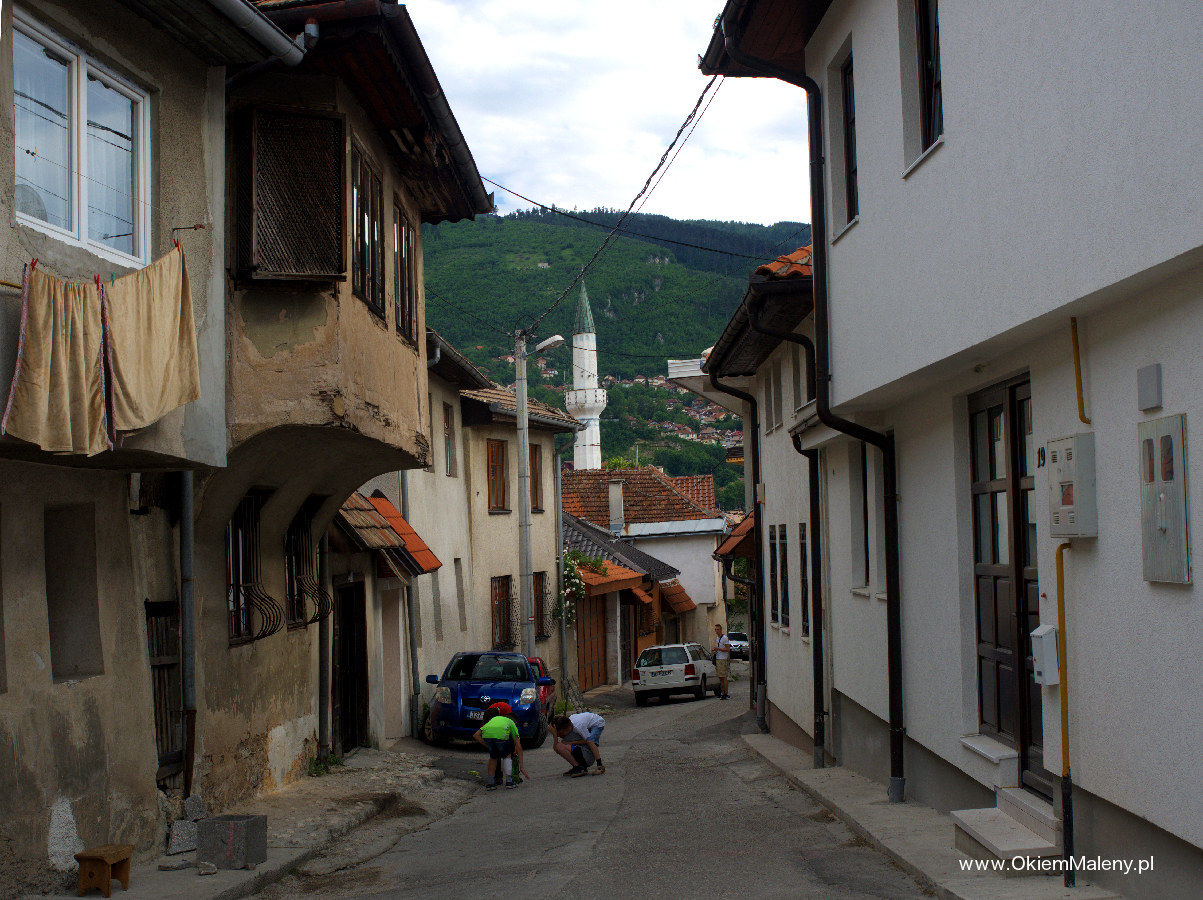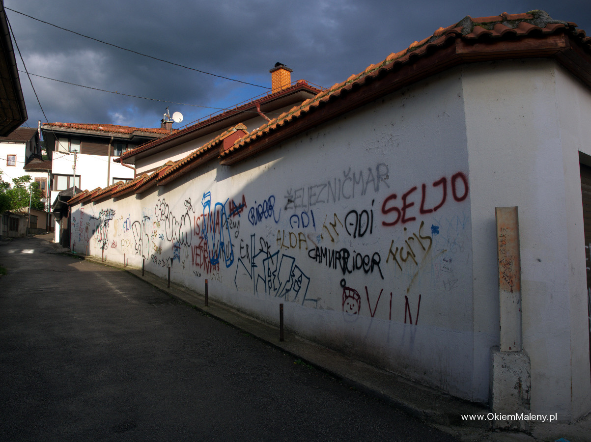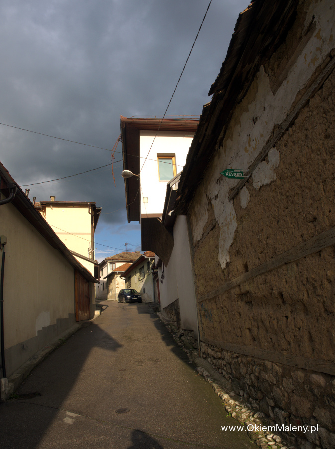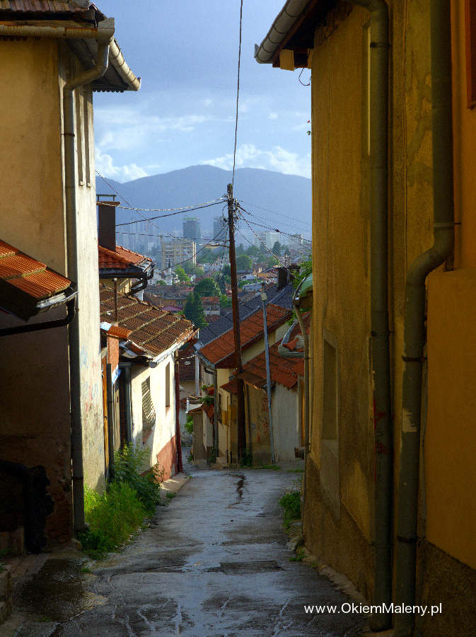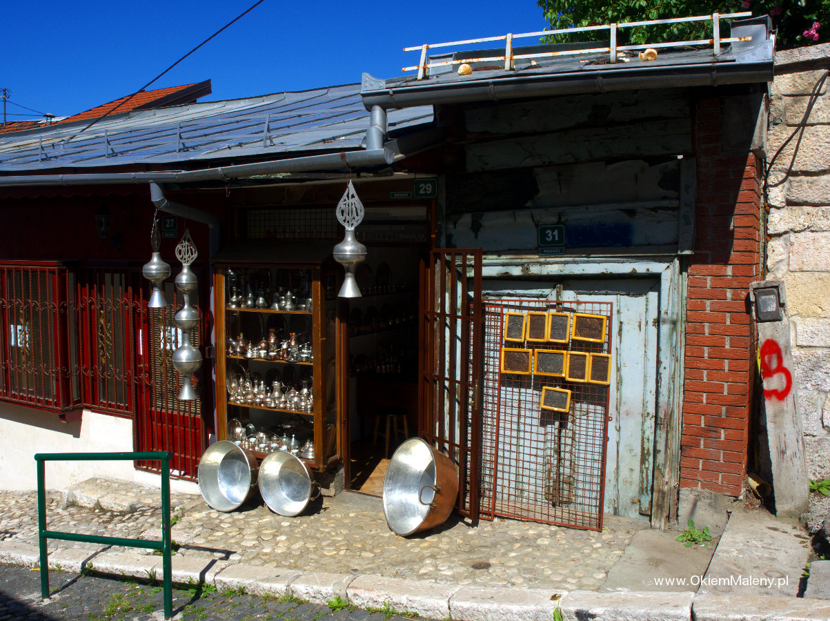 Gdy tylko deszcz przestał lać wbiłam w mapę pinezkę z lokalizacja knajpki i wyruszyłam na spacer. Z każdym krokiem Sarajewo robiło na mnie przyjemniejsze wrażenie. Przeszłam Baščaršije (targ miejski w obrębie starego miasta), zobaczyłam na własne oczy Sebilj (charakterystyczna drewniana fontanna w Sarajewie – o tym następnym razem), pokręciłam się chwilkę po okolicy i wyruszyłam, mniej więcej, w kierunku Kibe Mahala. Najpierw przeszłam przez klimatyczną uliczkę Kovači gdzie tak jak pisano we wszystkich źródłach słychać rytmiczne uderzania młoteczków i to tam powstają dżezwy (tygielki do parzenia kawy), małe czasze, mosiężne tacki, magnesy. Jedna z bardziej klimatycznych uliczek. Tuż nad nią pojawia się muzułmański cmentarz, a nad nim Žuta Tabija i zabytkowa dzielnica Vratnik. Plan na dzień następny.