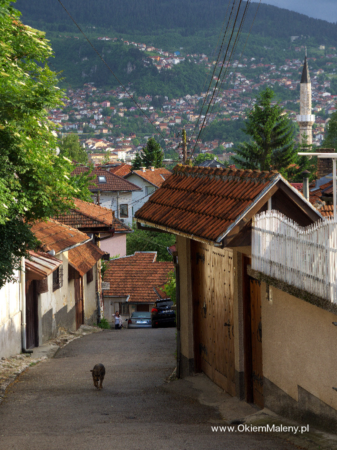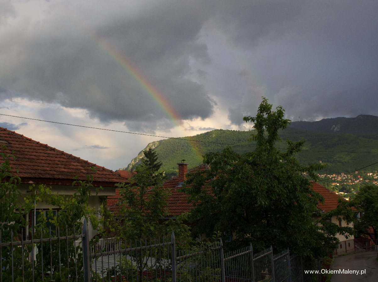 Sarajewo tego popołudnia było wyjątkowo magiczne. Na ulicach nie było żywego ducha. Za plecami, na niebie pojawiła się przepiękna tęcza. Błądziłam wąskimi uliczkami, jedyne co przeszkadzało w zanurzeniu się w tej chwili to gdzieniegdzie przebiegające bezpańskie psy. To jest zmora Sarajewa. Szczególnie dla kogoś kto panicznie boi się obcych psów. Błądzenie szło mi na tyle dobrze, że dość oddaliłam się od celu, ponieważ Słońce było coraz niżej postanowiłam trochę zdyscyplinować moje szwendactwo. Od celu dzielił mnie niecały kilometr gdy stanęłam jak wryta widząc cała armię wielkich psów siedzących na wzgórzu, koło którego prowadziła droga. Spojrzałam na mapę, nie wyglądało to optymistycznie, druga droga to dodatkowe 2 km. Słońce coraz niżej. Trudno. Zawróciłam, skręciłam w kolejna uliczkę.
