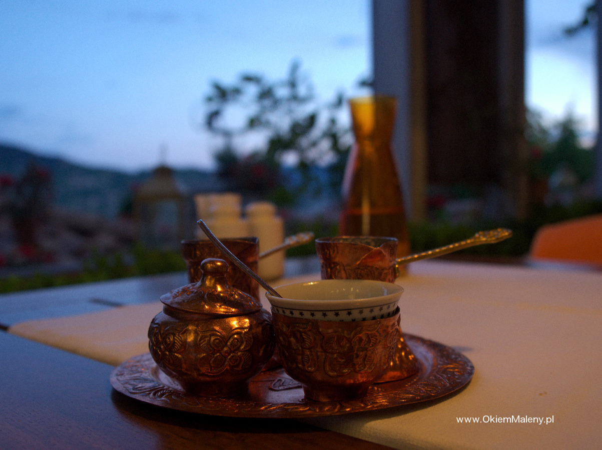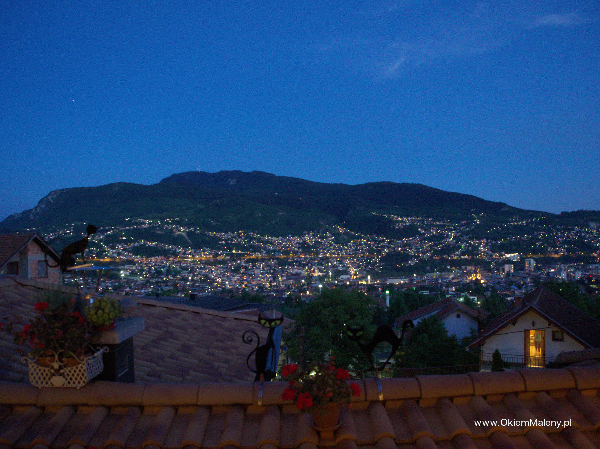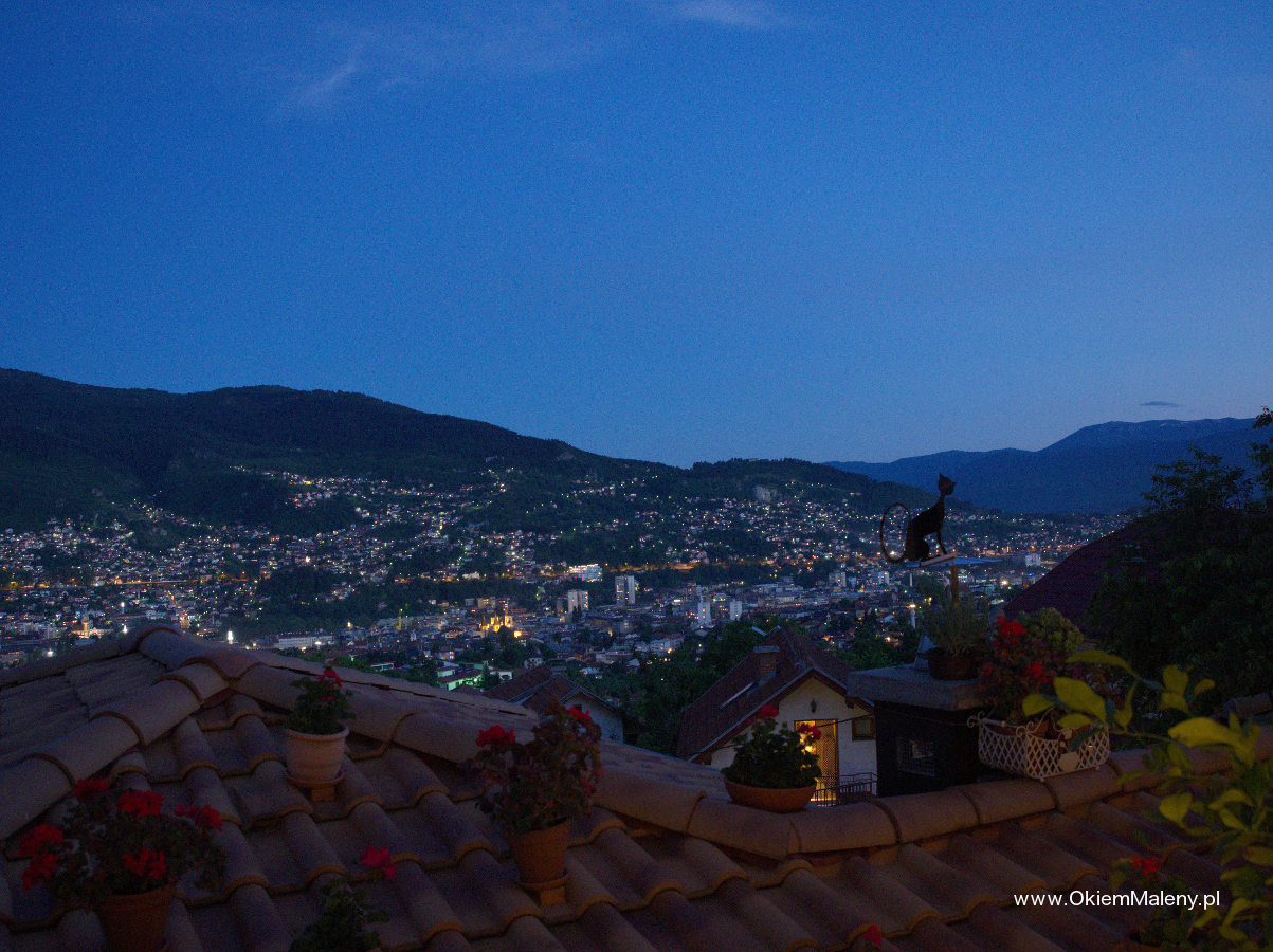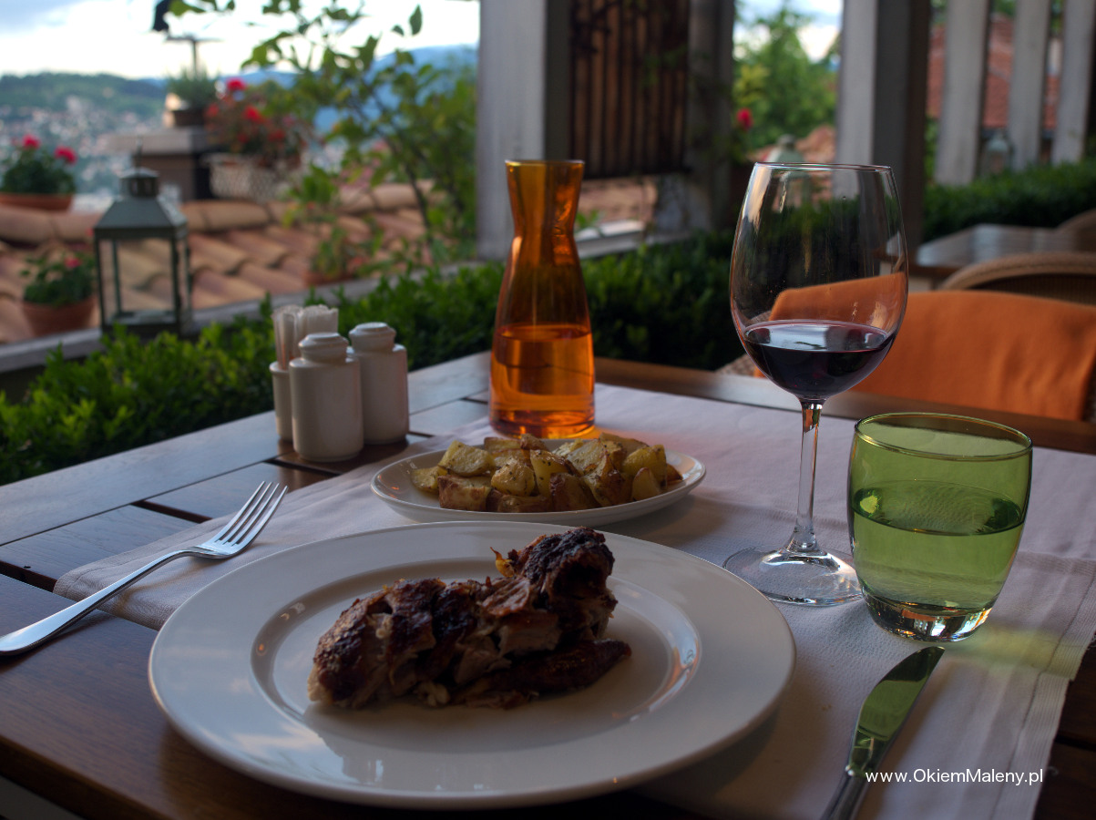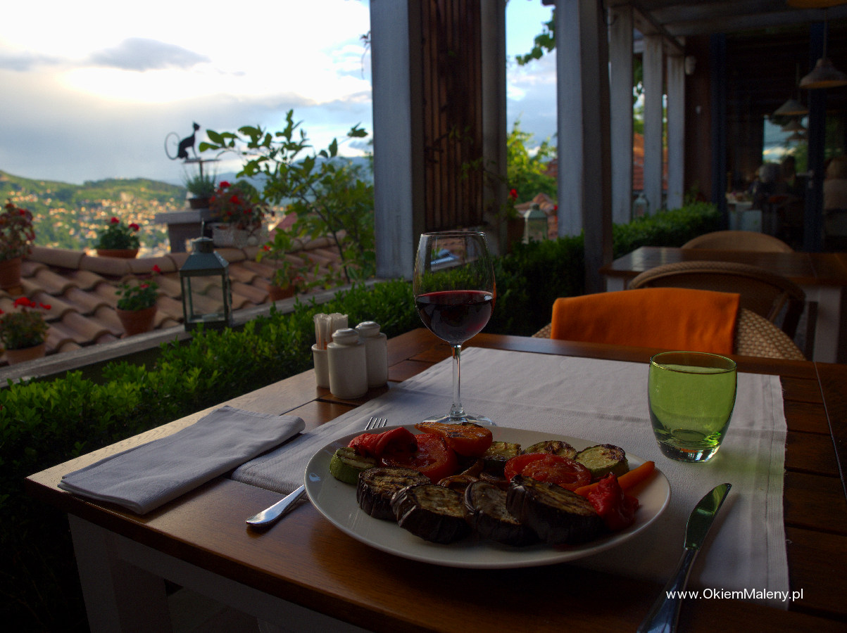 Wjechałam na drugie piętro, uśmiechnęłam się do kelnera, wyjaśniłam, że nie mam rezerwacji, ale przeczytałam w hostelu, że to najpiękniejsze miejsce na kolację, i wiem że jest wesele, ale jeśli mogłabym tylko zrobić zdjęcie? Zapytał dla ilu osób stolik. Odpowiedziałam, że jestem sama. Spytał, czy na tarasie nie będzie mi przeszkadzało. Szczęście się do mnie uśmiechnęło. Gdy zobaczyłam ceny w karcie uśmiechnęło się podwójnie. Siedziałam na cudnym tarasie, tuż przy oknie, przede mną roztaczał się widok na całe Sarajewo. Na tarasie na specjalnym ruszcie piekła się jagnięcina. Królewska kolacja w postaci grillowanych warzyw, jagnięciny (najlepszej pozycji z karty), pieczonych ziemniaczków, wody, wina i bośniackiej kawy wyniosła mnie 80 zł. Jedzenie było niesamowicie smaczne. A Sarajewo o zachodzie Słońca i tuż po prezentowało się cudnie. Okalające ciemne wzgórza, tlące się światła miasta. Cudo. Do centrum wróciłam taksówką, za równowartość chyba maksymalnie 3 euro.