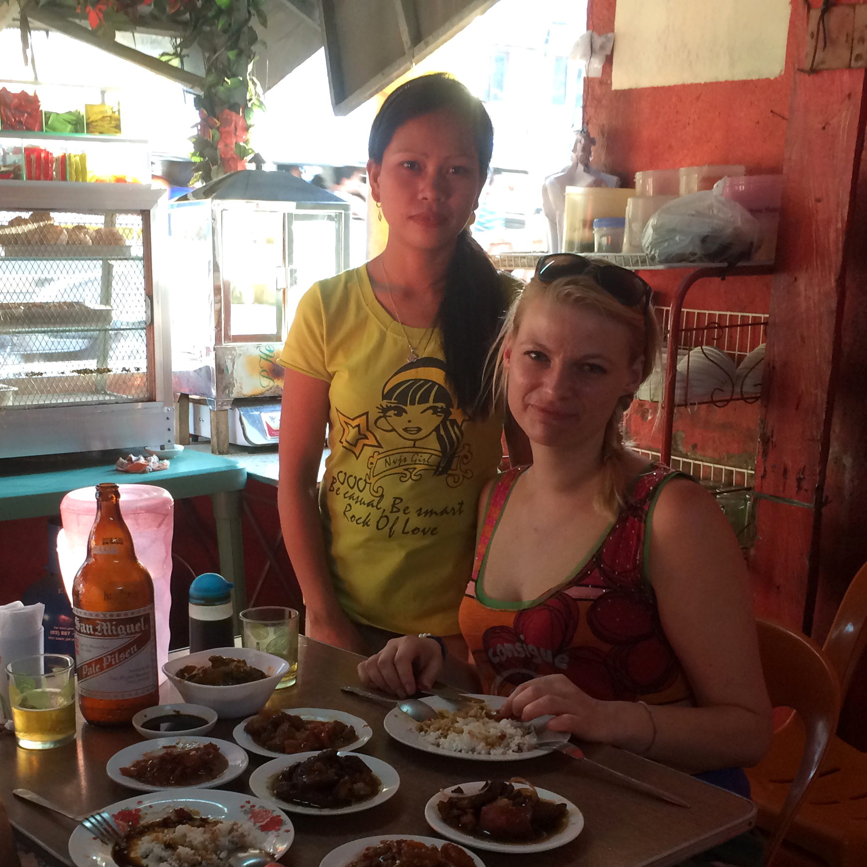 Tu jadłam pierwszy raz typowe filipińskie danie – adobo. Adobo to kawałki mięsa, ryb, warzyw lub owoców morza w zawiesistym, glazurowanym sosie składającym się z marynaty, czosnku, sosu sojowego. Czasem można znaleźć mięso z dodatkiem ananasów. Oczywiście podawane jest z ryżem i sosem sojowym, do którego warto wrzucić posiekaną ostrą papryczkę. Oczywiście jeśli lubi się naprawdę ostre jedzenie. Najczęściej trafiałam na adobo wieprzowe i tak sobie myślę, że w całym życiu nie zjadłam tyle świnki co na Filipinach. Jedne z najlepszych adobo jadłam właśnie w Pagsawitanie oraz w El Nido – tam było adobo z kalmarów – bajka.