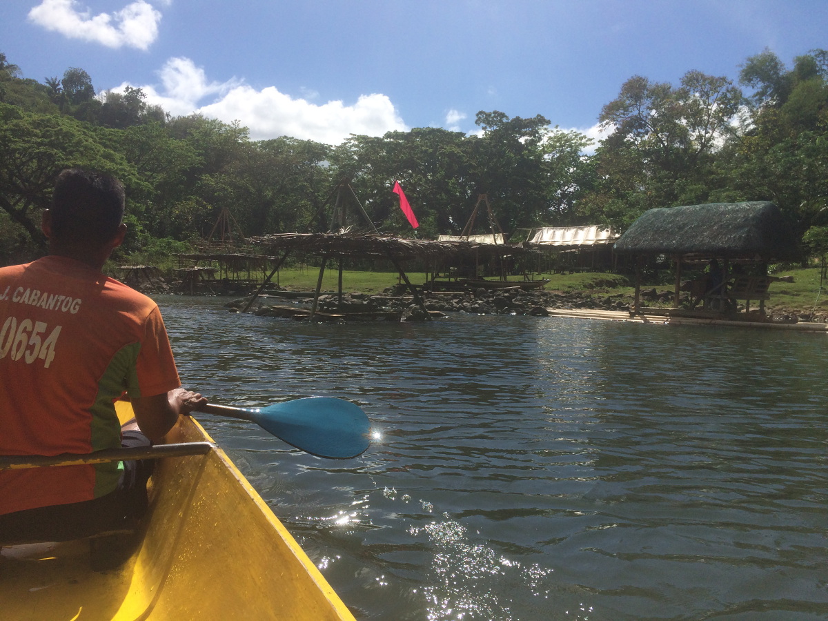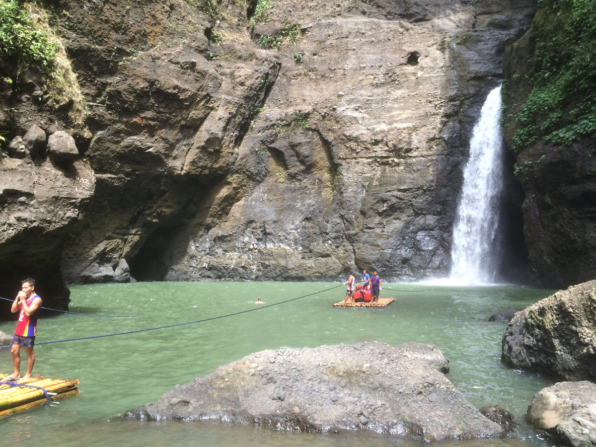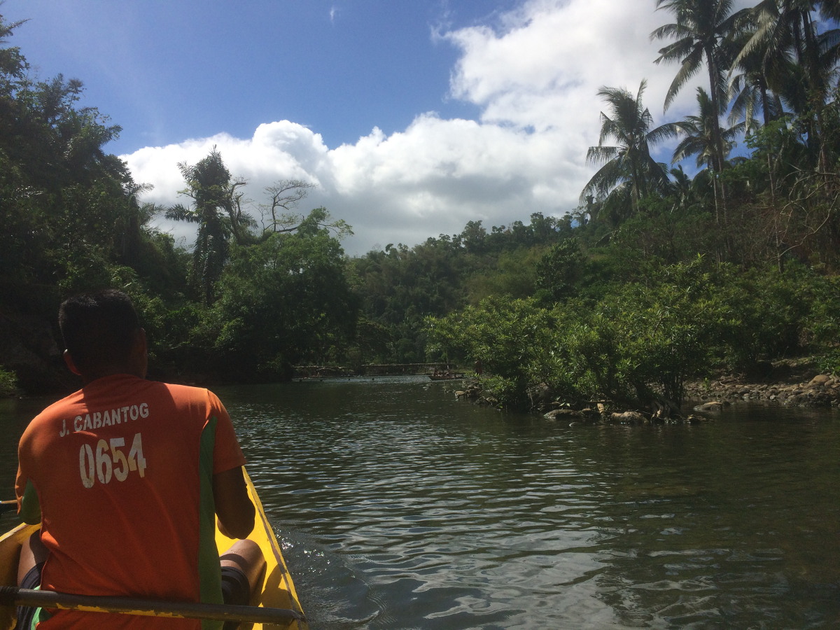 Do Pagsanjanu kursują jeepneye. Bilety na spływ rzeką Bumbungan i wpłynięcie pod wodospad na bambusowej tratwie można kupić w agencji naprzeciwko kościoła (ok. 1200 pesos). Z Pagsanjanu mam zdjęcia robione tylko telefonem i to ukradkiem, bo choć woda wygląda na spokojną to nagle pojawiały się niespodziewane spiętrzenia wody i telefon siedział asekuracyjnie w worku wodoszczelnym. Pod koniec marca poziom wody był dość niski i w wielu miejscach sternik tak naprawdę przepychał łódkę między kamieniami po okrągłych drewnianych balach wystających z wody. Gdy poziom wody jest wyższy musi być naprawdę duża frajda. Najpierw przepływa się wzdłuż wsi, potem krajobraz się zmienia, z obu stron łódki wyrastają pionowe skały. Jest bajecznie. Na końcu podróży jest wodospad Pagsanjan, jeden z bardziej znanych filipińskich wodospadów. Podobno ma 120 metrów wysokości, choć nie wyglądał na aż tyle. U jego podnóży jest małe oczko wodne. Po tym oczku płynie, a raczej jest przeciągana po linie bambusowa tratwa, na której wpływa się pod wodospad do małej pieczary. Worek wodoszczelny zdał egzamin 😉