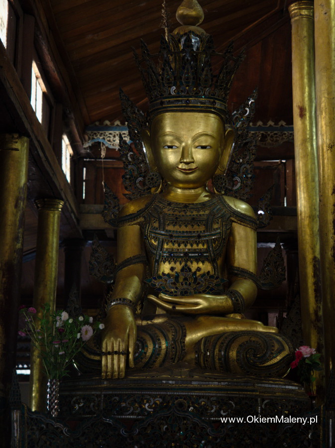 Rzeczywiście kotów w klasztorze cała armia. Co prawda wszystkie jak na złość spały, a nie skakały. Jednak to nie z powodu ich akrobatycznych sztuczek warto odwiedzić to miejsce. Świątynia jest wyjątkowa. To piękny, drewniany klasztor. Słynie z wizerunków Buddy w tybetańskim stylu. Rzeczywiście są przepiękne. A jeśli już jesteśmy przy temacie drewnianych klasztorów, to jest to jeden ze znaków charakterystycznych Mjanmy. I temat na całkiem odrębny post.