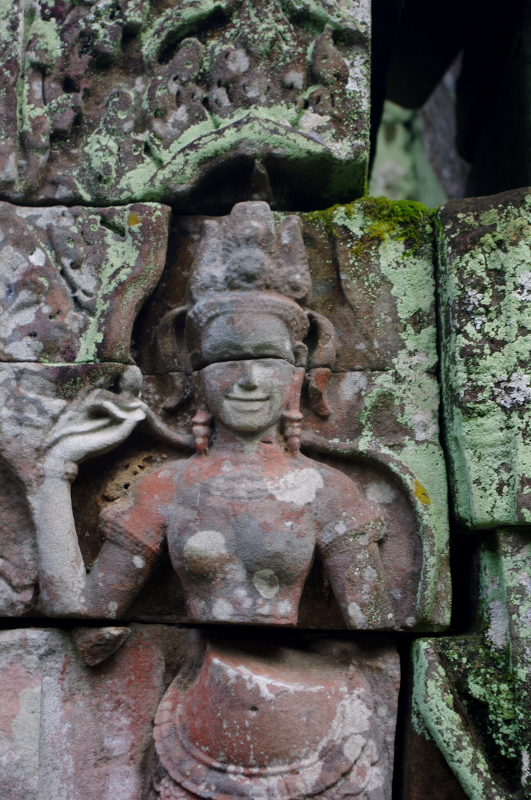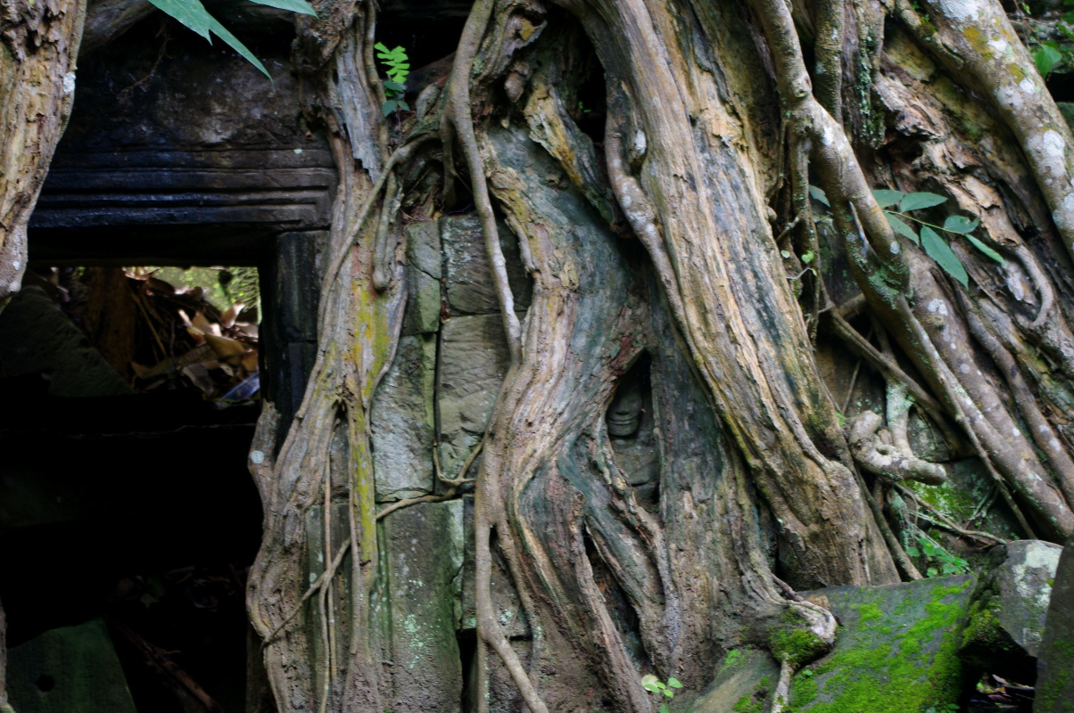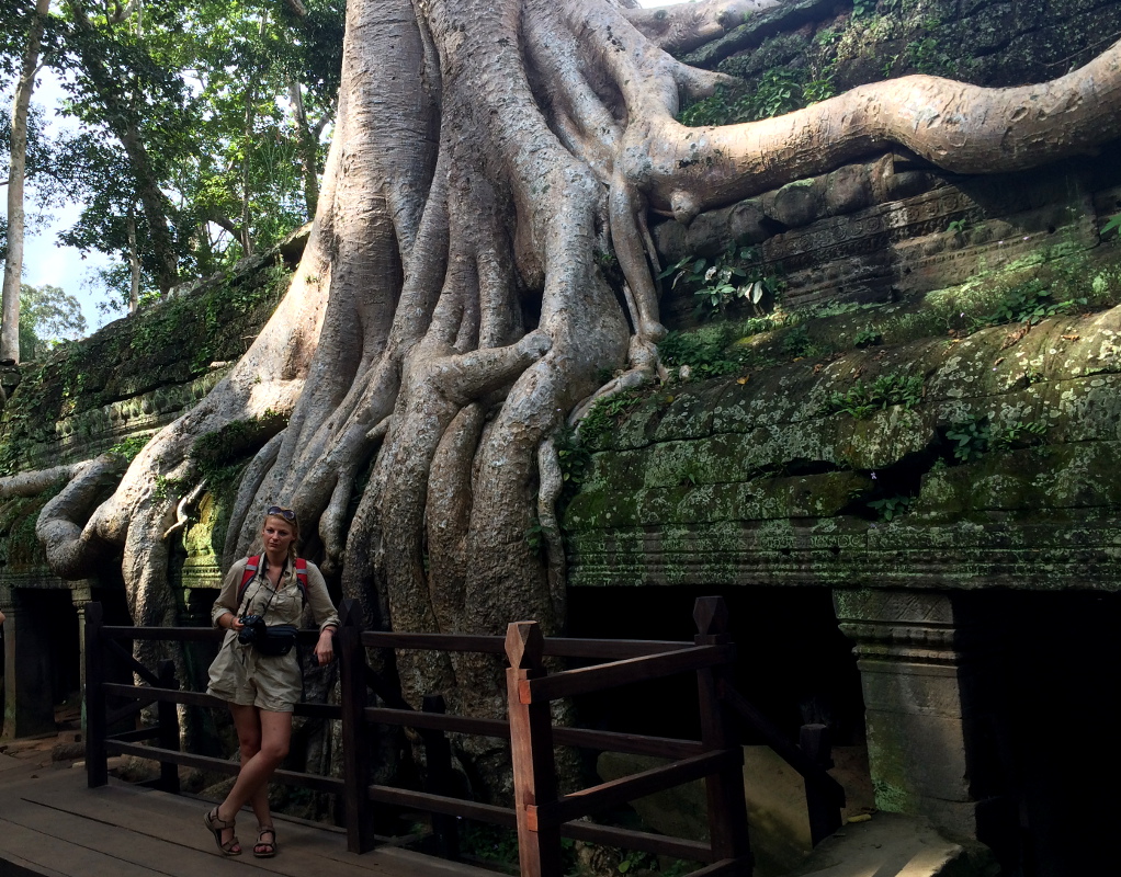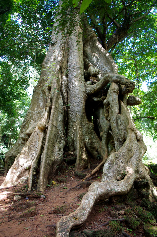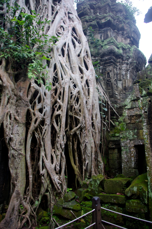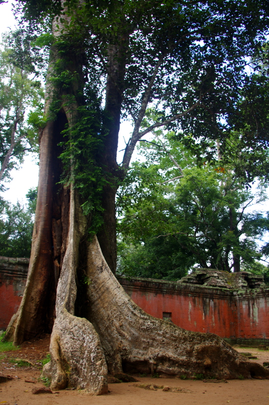 Zaraz po wizycie o wschodzie słońca w Angkor Wat i po zasłużonym śniadaniu udaliśmy się do Ta Phrom. Świątynia ta w 2001 roku była miejscem akcji filmu Tomb Raider. Została wzniesiona w XII wieku przez króla Dżajavarmana VII i pełniła rolę buddyjskiego klasztoru oraz uniwersytetu. W okresie świetności teren klasztorny zamieszkiwało ponad 12.000 osób. Jako jedna z nielicznych świątyń Angkoru została pozostawiona w takim stanie w jakim ją odnaleziono. Na terenie dawnego klasztoru niepodzielnie zapanowała dżungla. Potężne dyniowce, figowce bengalskie wdarły się na teren świątyni splatając się z jej murami w jedną całość. Wielkie omszałe kamienne bloki, płaskorzeźby zdobiące mury, czasem szczelnie ukryte w plątaninie korzeni. To wszystko tworzy wrażenie absolutnie niesamowite. Gdyby jeszcze zmniejszyć ilość odwiedzających o jakieś 2/3 byłoby cudownie.