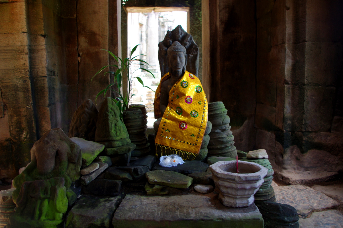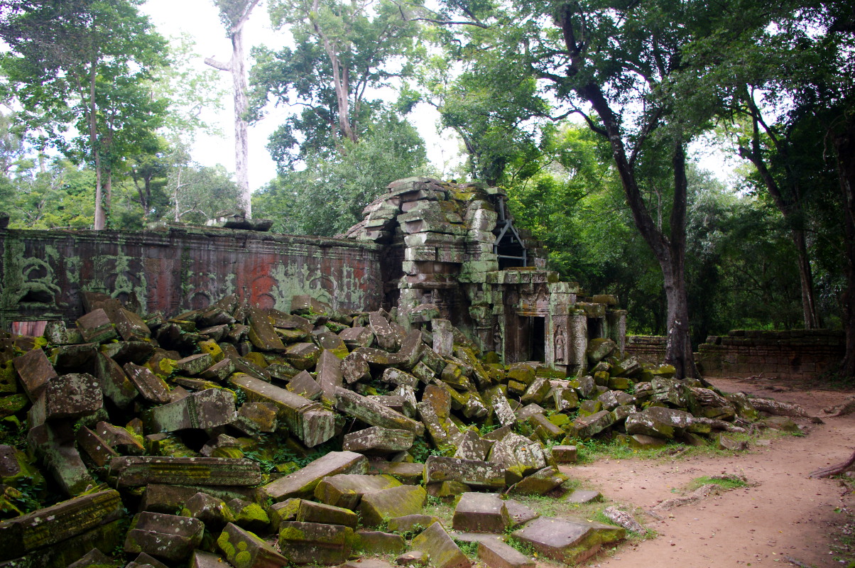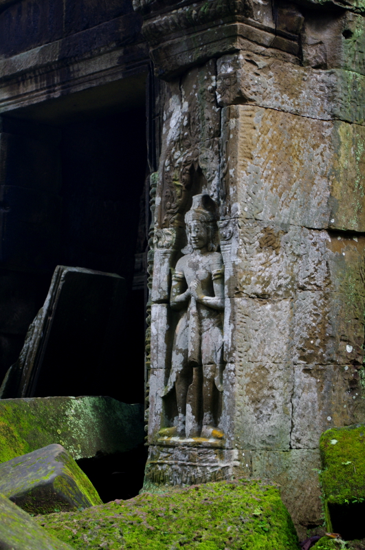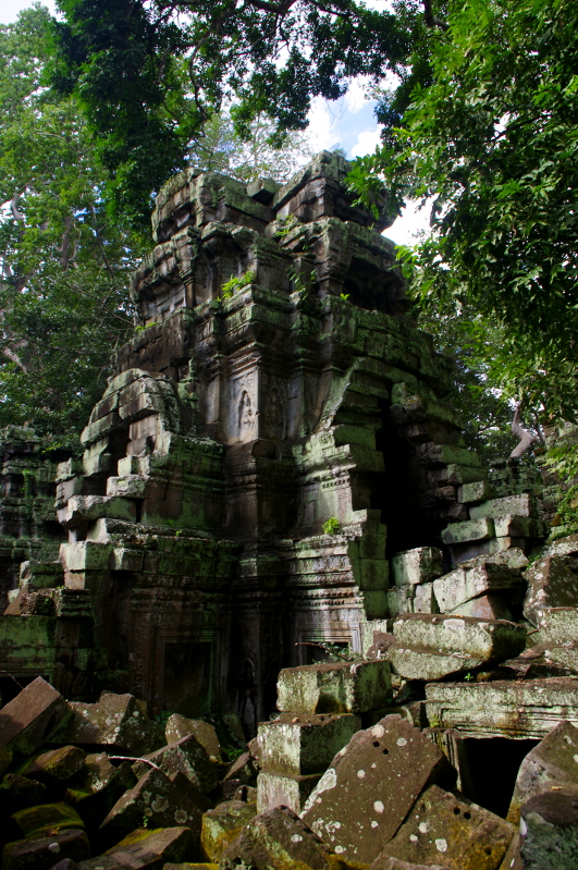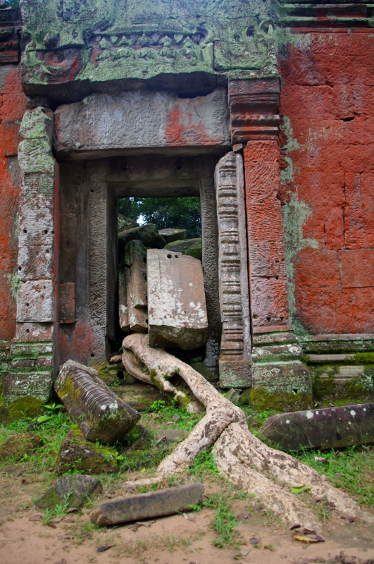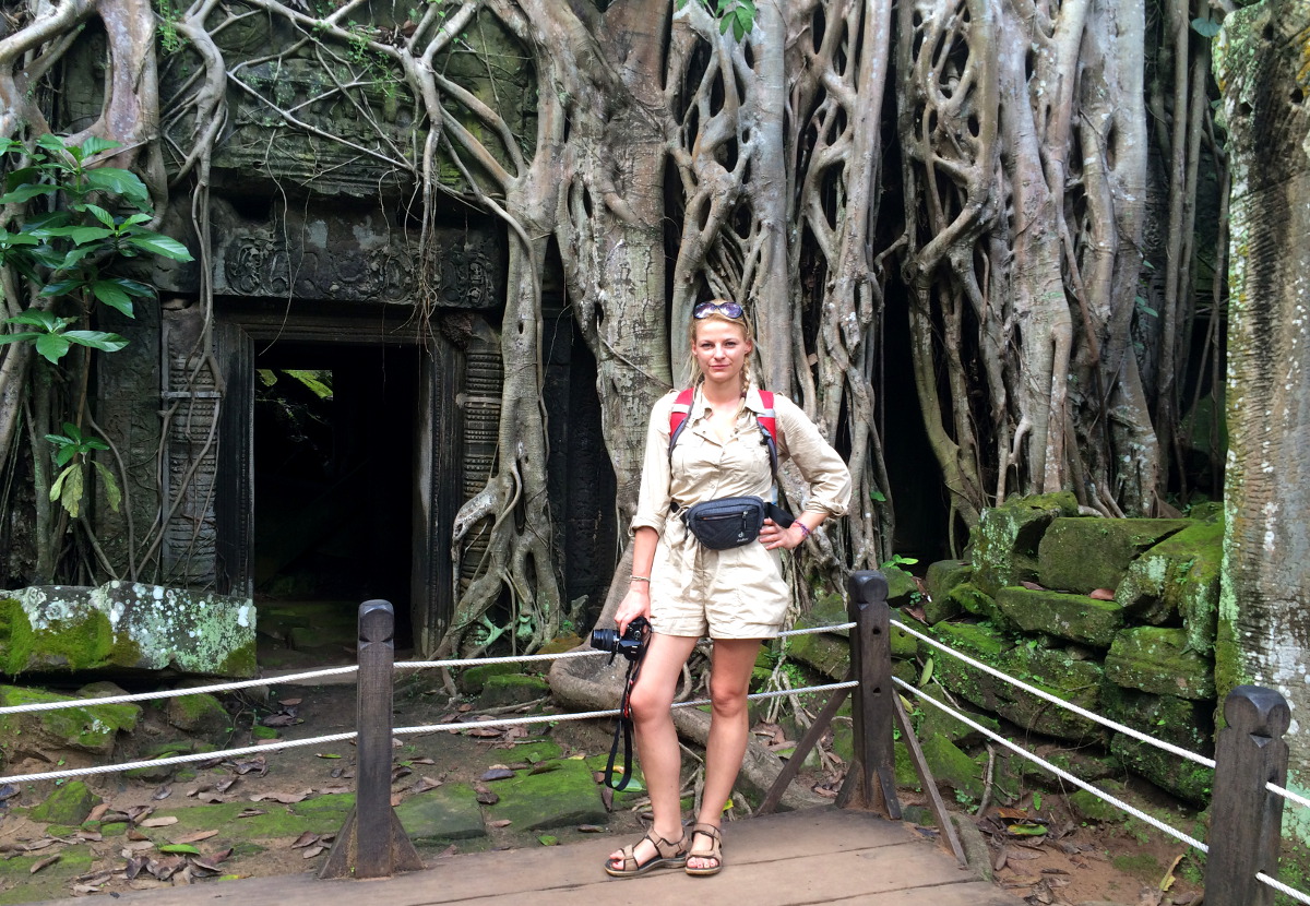 Zaraz po wizycie o wschodzie słońca w Angkor Wat i po zasłużonym śniadaniu udaliśmy się do Ta Phrom. Świątynia ta w 2001 roku była miejscem akcji filmu Tomb Raider. Została wzniesiona w XII wieku przez króla Dżajavarmana VII i pełniła rolę buddyjskiego klasztoru oraz uniwersytetu. W okresie świetności teren klasztorny zamieszkiwało ponad 12.000 osób. Jako jedna z nielicznych świątyń Angkoru została pozostawiona w takim stanie w jakim ją odnaleziono. Na terenie dawnego klasztoru niepodzielnie zapanowała dżungla. Potężne dyniowce, figowce bengalskie wdarły się na teren świątyni splatając się z jej murami w jedną całość. Wielkie omszałe kamienne bloki, płaskorzeźby zdobiące mury, czasem szczelnie ukryte w plątaninie korzeni. To wszystko tworzy wrażenie absolutnie niesamowite. Gdyby jeszcze zmniejszyć ilość odwiedzających o jakieś 2/3 byłoby cudownie.